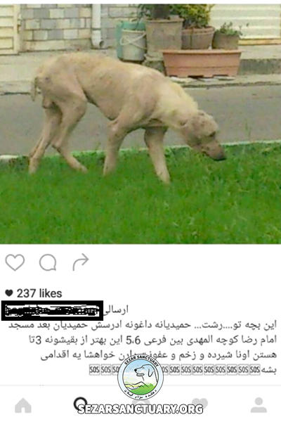 - Lucy and her only lived baby, the lonely beaten up stray dog that we found in Rasht, Iran. Lucy been beaten by the people of this area. Apparently she had 9-8 puppies but only one was still around her; the other puppies are missing. Special thanks to those who been helping Lucy and her only left baby by feeding them and helping us to rescue them.